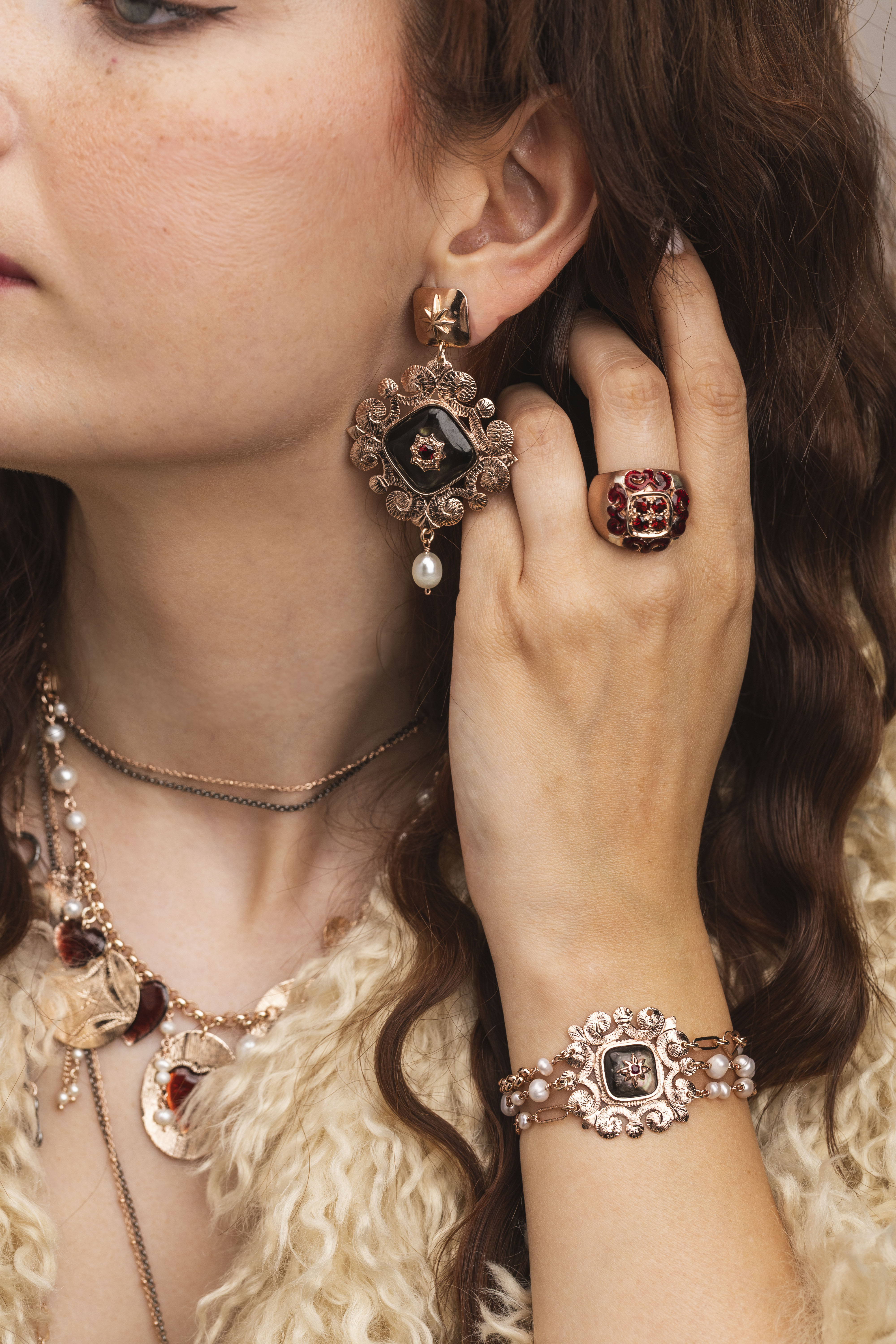 Anello in argento, galvanica rosata, il toppo dell’anello è composto da quattro granati incastonati e smalto rosso.