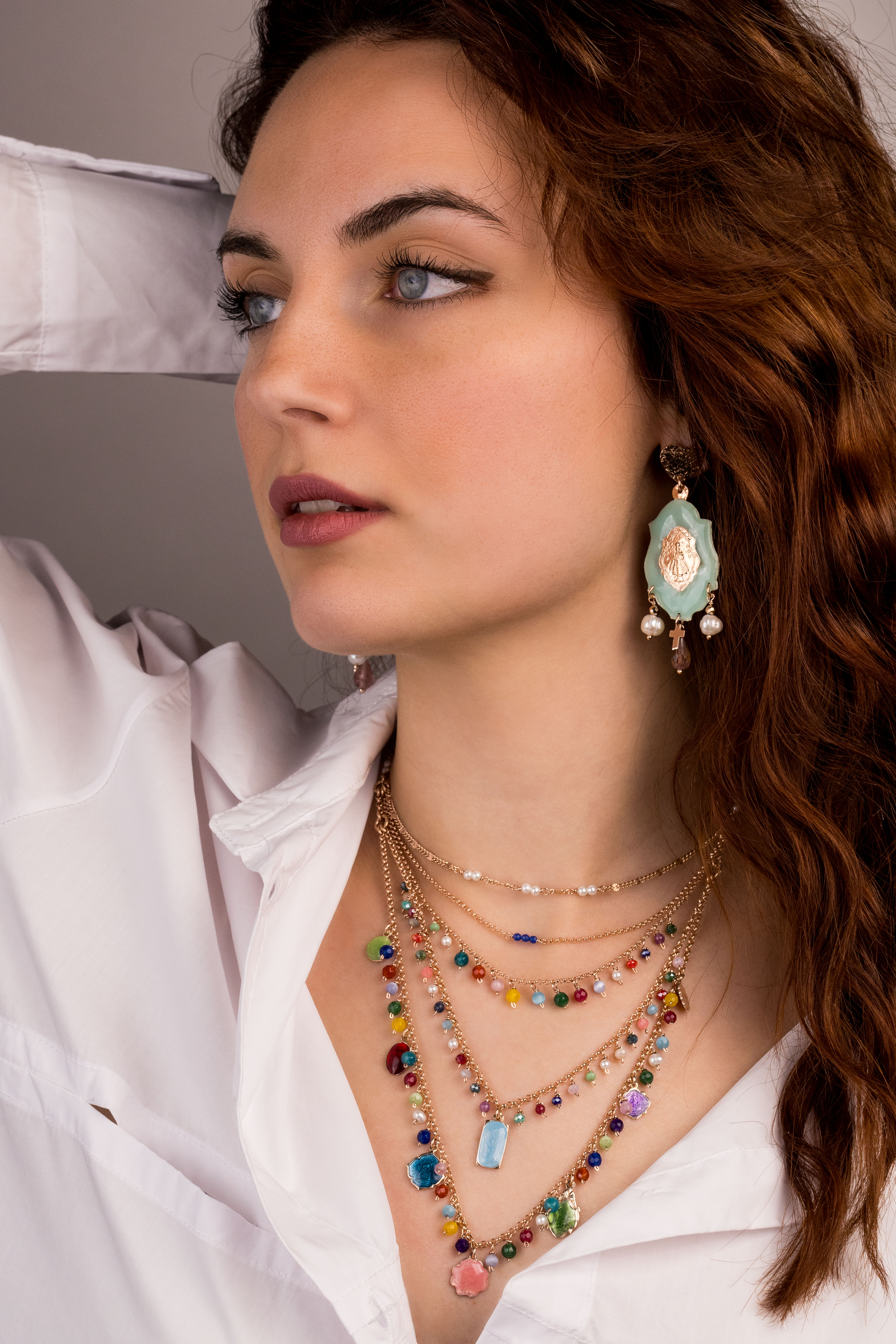 Collana in argento con galvanica oro rosa. Ispirata ai colori dell'estate, questa collana è decorata da numerose pietre naturali accompagnate da madonnine smaltate.