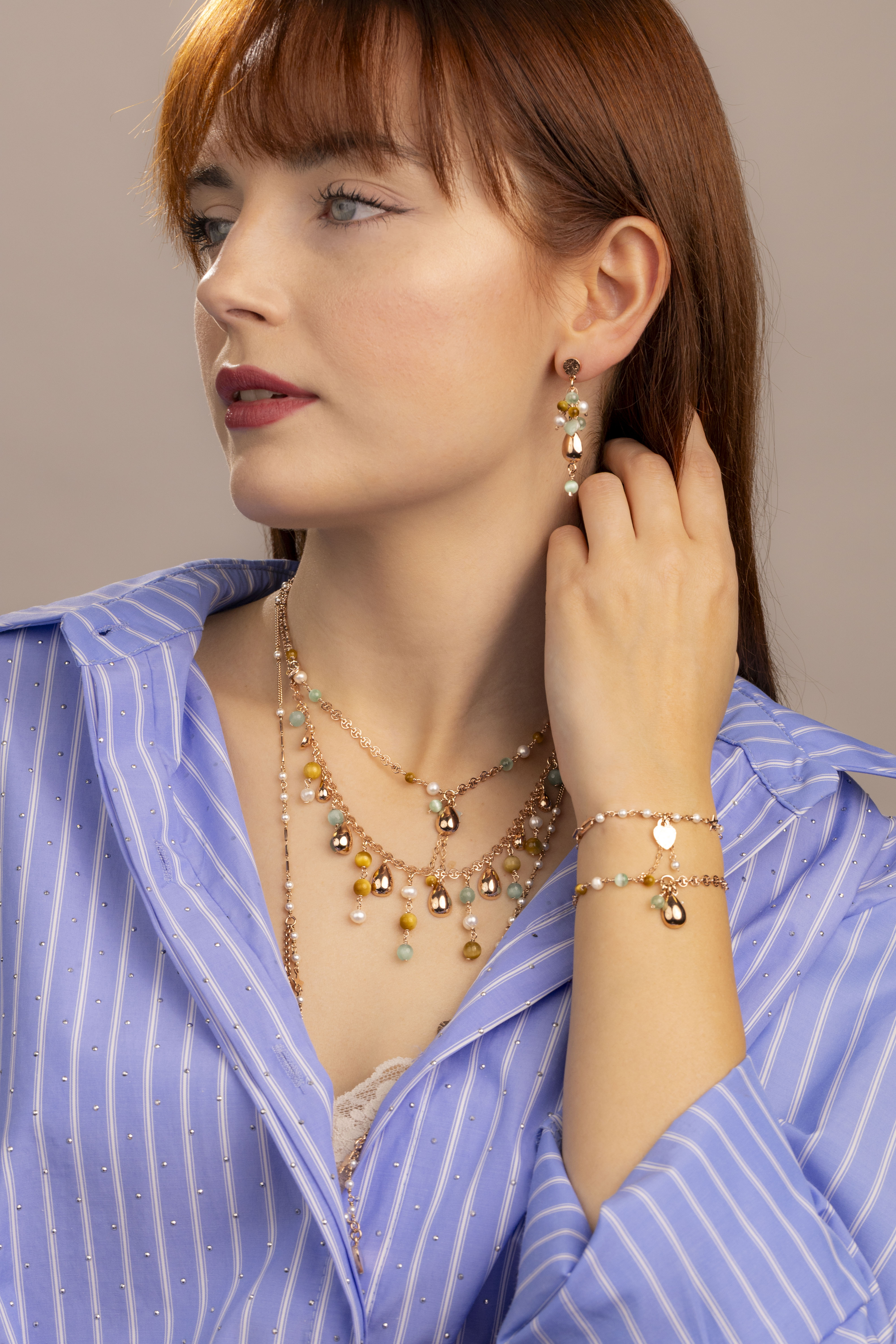 Orecchini a grappolo in argento con galvanica oro rosa. I pendenti sono delle goccioline lucide e i colori delle pietre richiamano toni selvaggi.