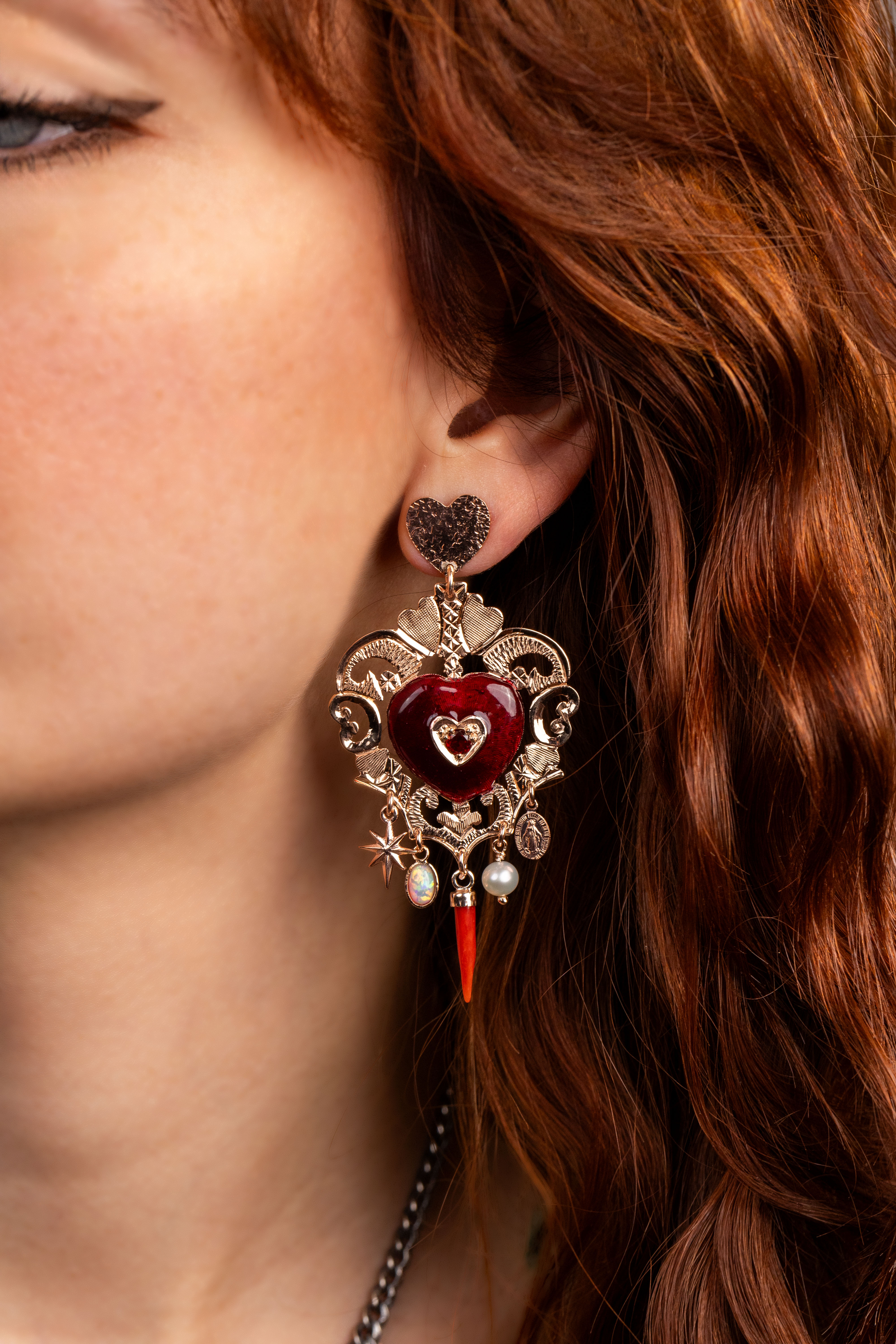 Orecchini in argento galvanica oro rosa. Coppia di orecchini a forma di cuore sacro, composta da ciondoli in argento e perla pendente. Al centro un cuore smaltato rosso con incastonata un granato